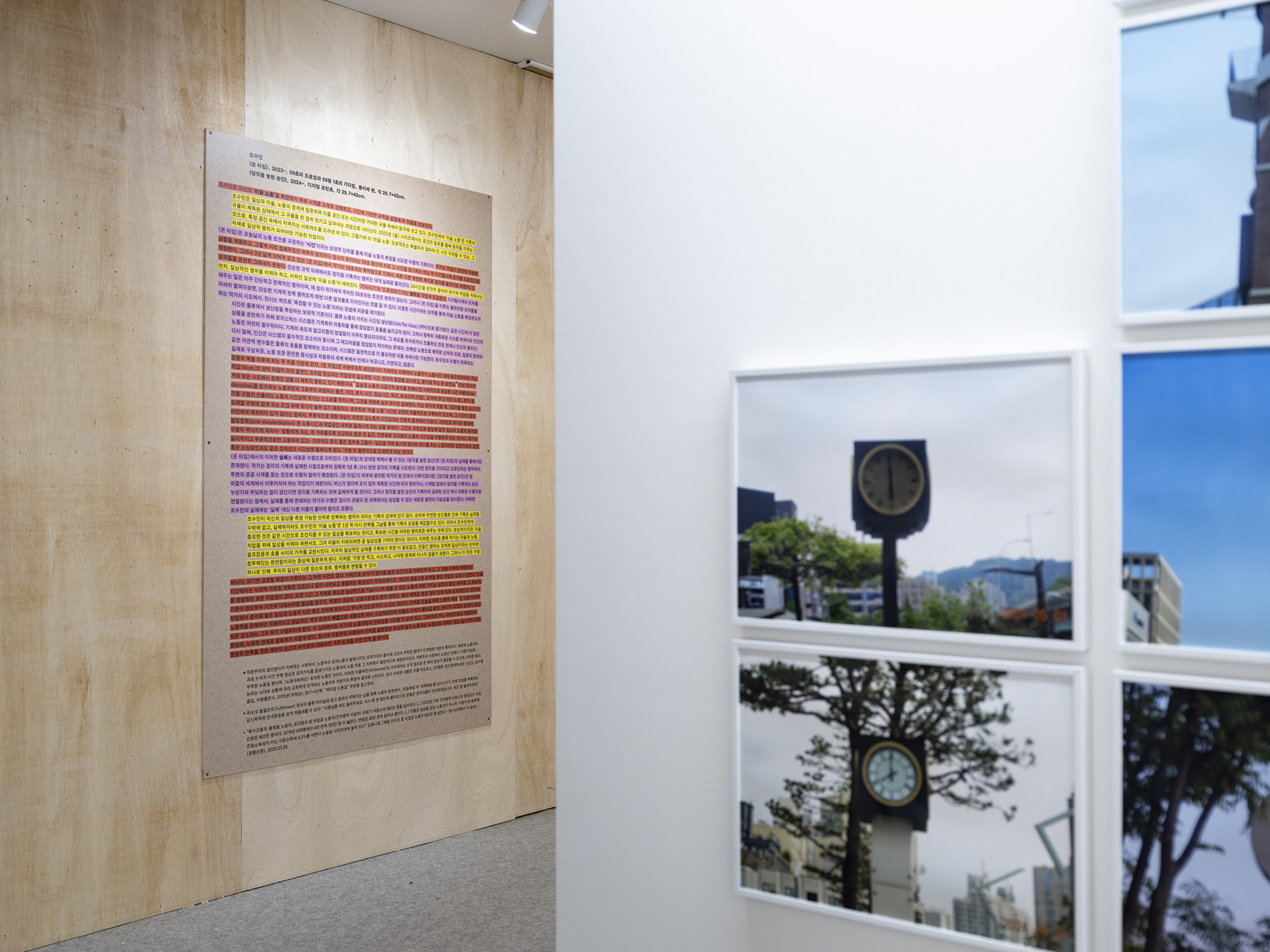 〈온 타임〉에서의 이러한 실패는 새로운 수행으로 이어진다. 〈온 타임〉의 반대편 벽에서 볼 수 있는 〈정각을 놓친 순간〉은 〈온 타임〉의 실패를 통해서만 존재한다. 작가는 정각의 기록에 실패한 시점으로부터 정확히 1년 후, 다시 한번 정각의 기록을 시도한다. 다만 정각을 기다리고 드로잉하는 행위에서 주변의 공공 시계를 찾는 것으로 수행의 범위가 확장된다. 〈온 타임〉이 외부와 분리된 작가의 방 안에서 이루어졌다면, 〈정각을 놓친 순간〉은 방 바깥의 세계에서 이루어져야 하는 작업이기 때문이다. 버스가 정각에 오지 않아 계획한 시간에 타지 못하거나, 시계탑 앞에서 정각을 기록하는 순간 누군가와 부딪히는 일이 생긴다면 정각을 기록하는 것에 실패하게 될 것이다. 그러나 정각을 놓친 순간의 기록마저 실패한 순간 역시 새로운 수행으로 연결된다는 점에서, 실패를 통해 연쇄되는 작가의 수행은 정시가 규범이 된 세계에서는 상상할 수 없는 새로운 행위의 가능성을 암시한다. 어쩌면 조수민의 실패에는 ‘실패’ 대신 다른 이름이 붙어야 할지도 모른다.