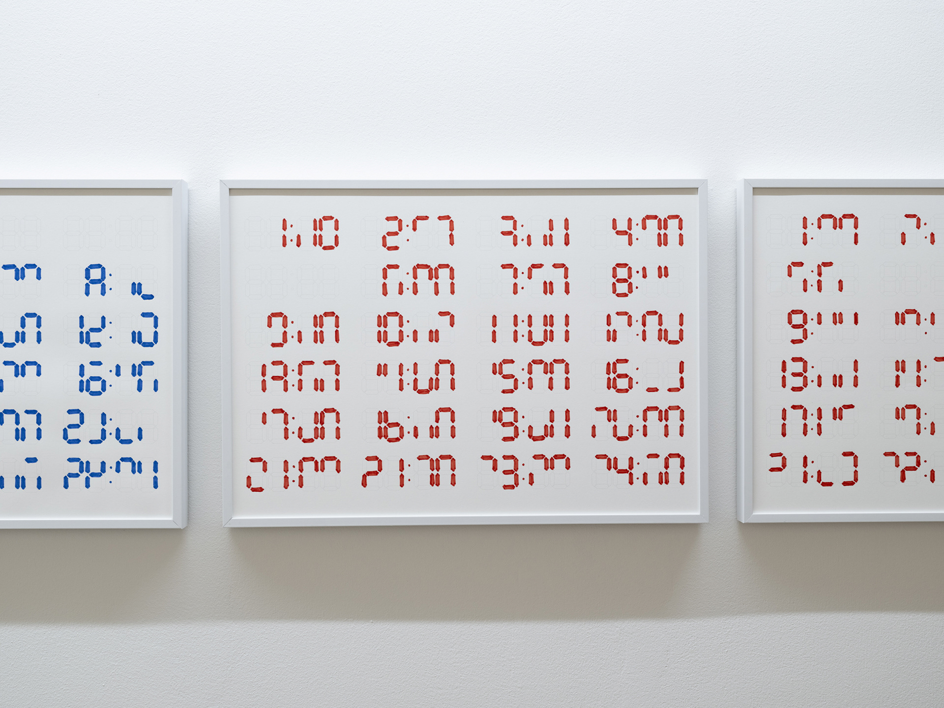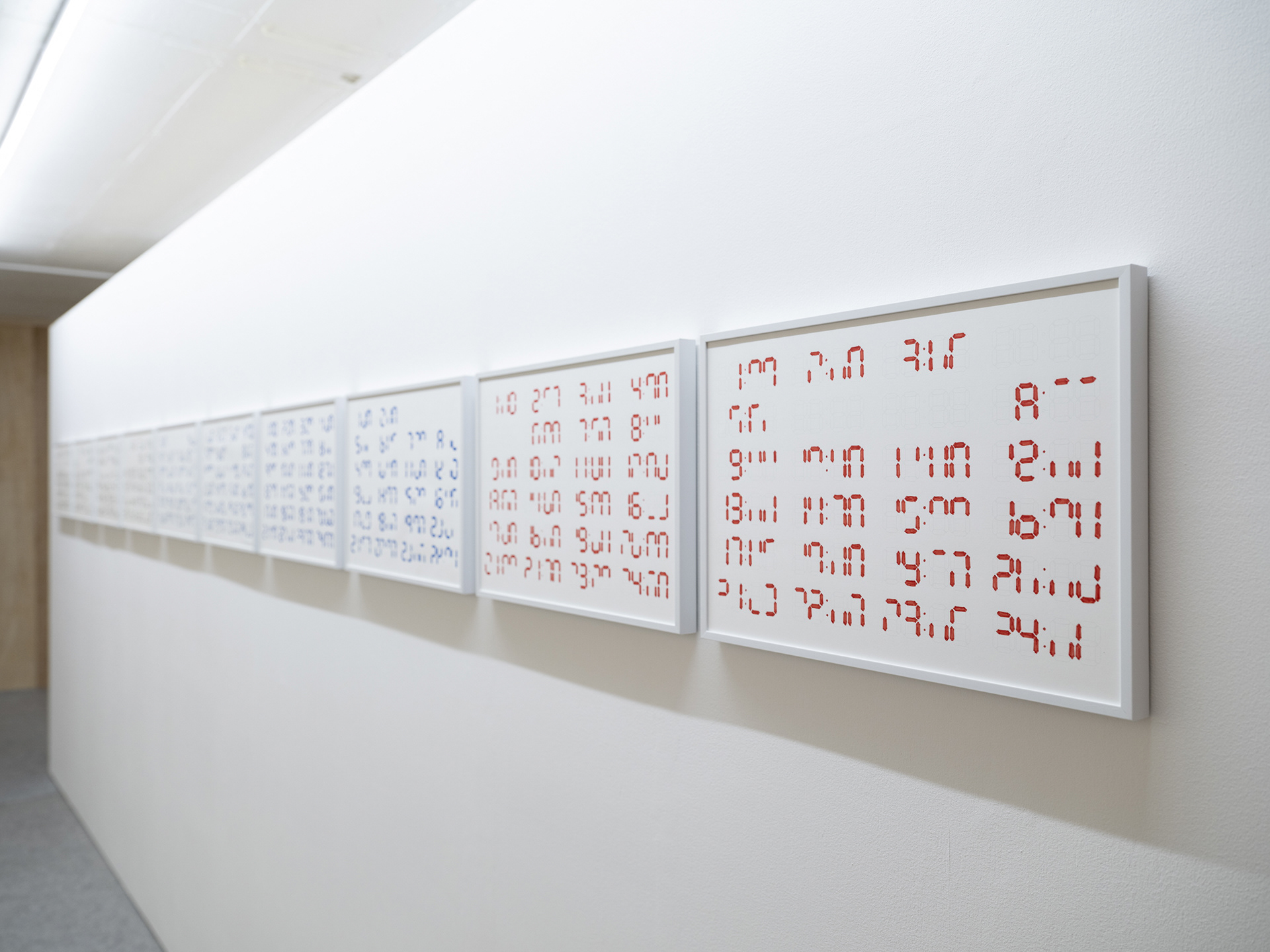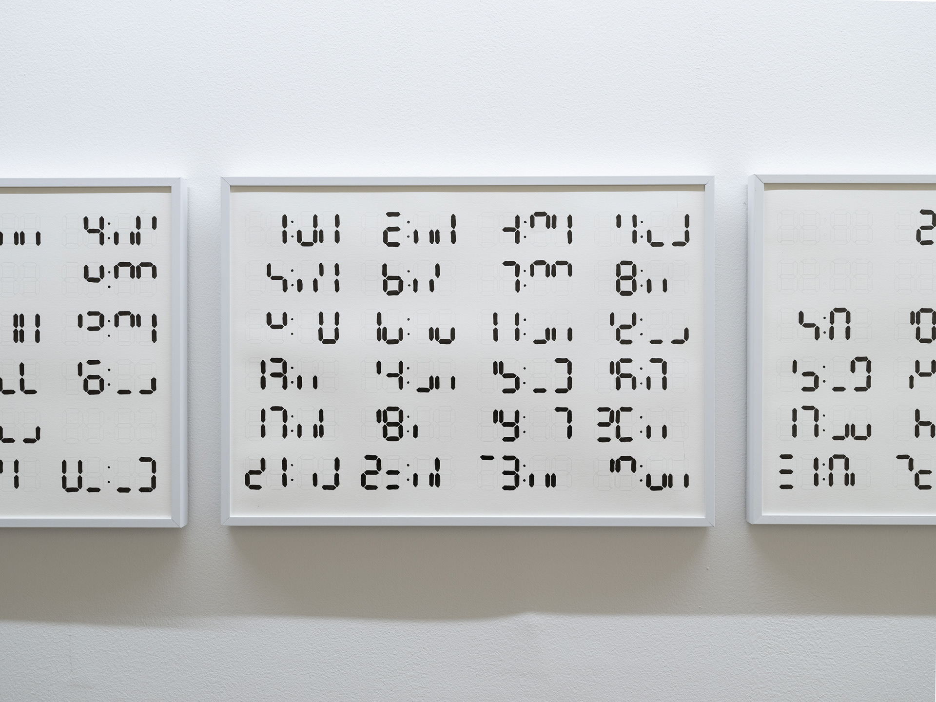〈온 타임〉은 오늘날의 노동 조건을 규정하는 ‘시간’이라는 보편적 단위를 통해 미술 노동의 측정을 시도한 수행적 기록이다. 작가는 작업이 온전히 가능한 날들을 계획하고, 그렇게 미리 정해두었던 하루의 정각마다 정시가 유지되는 59초 동안에 바로 그 시간을 표시하는 책상 위 디지털시계 숫자를 드로잉으로 재현한다. 그러나 3년 넘게 이어져 오고 있는 〈온 타임〉에서 작가는 59초라는 촉박함으로 인해서, 때론 다른 우연한 계기로 정각을 놓치기도 하면서, 그 숫자들을 온전히 그려내지 못한다. 단순한 규칙 아래에서도 정각을 기록하는 행위는 대개 실패로 돌아간다. 24시간을 온전히 쏟아야 하기에 작업을 위해서는 먼저, 일상적인 행위를 비워야 하고, 비워진 일상에 ‘미술 노동‘이 채워진다. 작가는 ‘기다리기’와 ‘드로잉하기’라는 행위를 작업에 도입한다. 디지털시계의 숫자를 채우는 일은 아주 간단하고 반복적인 행위이며, 매 정각 작가에게 주어진 59초라는 조건은 변하지 않는다. 그러나 〈온 타임〉을 이루는 불완전한 숫자들을 자세히 들여다보면, 단순한 기계적 반복 행위조차 매번 다른 결과물로 이어진다는 것을 알 수 있다. 이렇듯 시간이라는 단위를 통해 미술 노동을 측정하고자 하는 작가의 시도에서, 전시는 역으로 ‘측정할 수 있는 노동’이라는 관념에 의문을 제기한다.