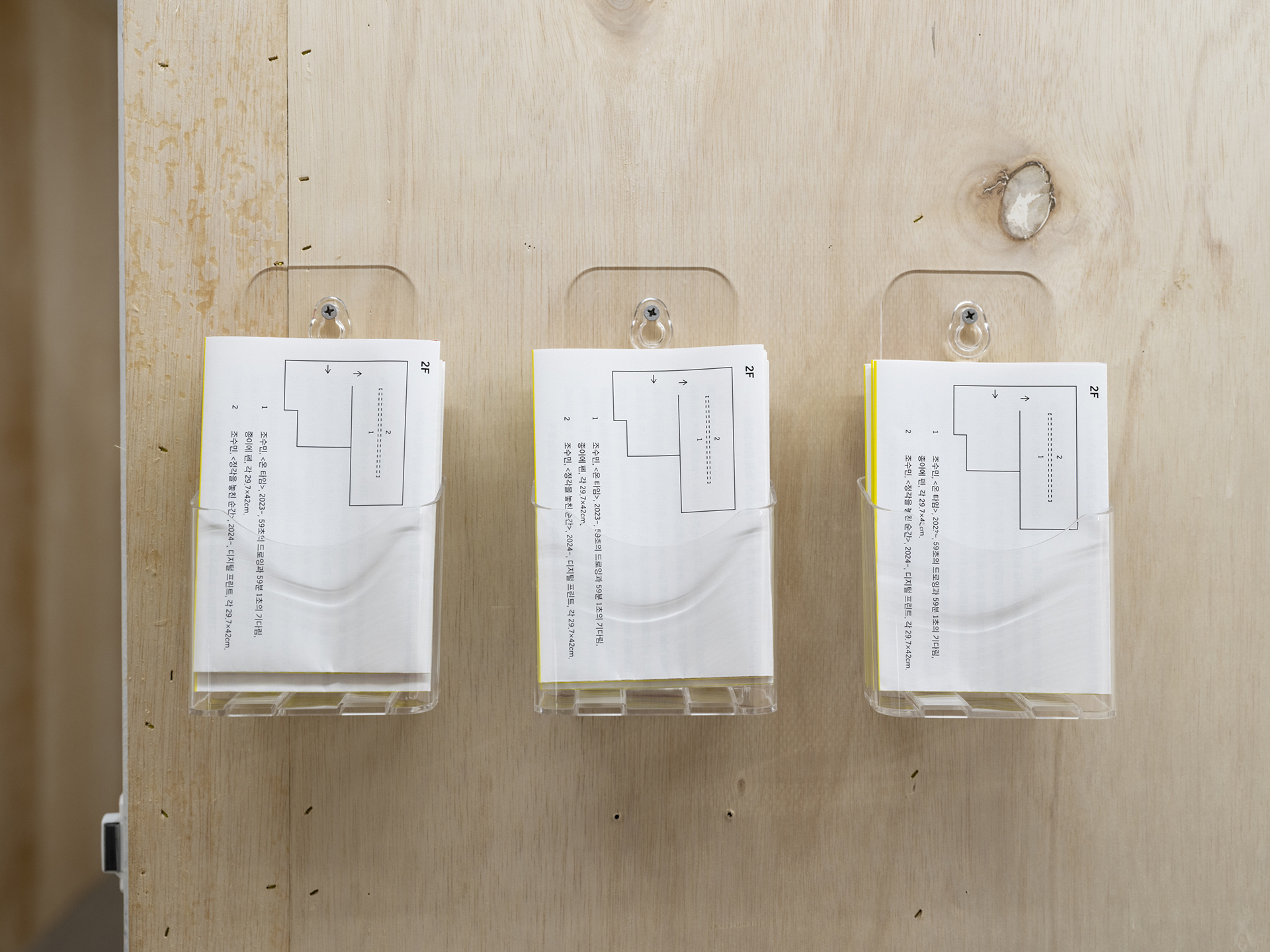 조수민이 자신의 일상을 측정 가능한 단위로 반복하는 행위의 의미는 기록의 성패에 있지 않다. 오히려 우연한 순간들로 인해 기록은 실패할 수밖에 없고, 실패하더라도 조수민의 ‘미술 노동’은 1년 뒤 다시 반복될 그날을 통해 기록의 성공을 예감할수도 있다. 따라서 조수민에게 중요한 것은 같은 시간으로 조건지을 수 있는 일상을 확보하는 것이고, 확보된 시간을 어떠한 행위로든 채우는 것에 있다. 모순적이지만, 미술 작업을 위해 일상을 비워야 하면서도, 그의 미술이 지속되려면 곧 일상성을 가져야 한다는 것이다. 이러한 모순을 통해 작가는 미술과 노동, 쓸모없음과 효율 사이의 가치를 교란시킨다. 지극히 일상적인 상태를 구축하기 위한 이 쓸모없고, 끈질긴 행위는 오히려 일상이라는 단어에 침투해있는 완전함이라는 환상에 질문하게 된다. 이처럼 ‘구멍’은 작고, 사소하고, 나약한 문제에 지나지 않을지 모른다. 그러나 이 작은 구멍 하나로 인해 우리의 일상이 다른 장소와 경로, 행위들로 변형될 수 있다.