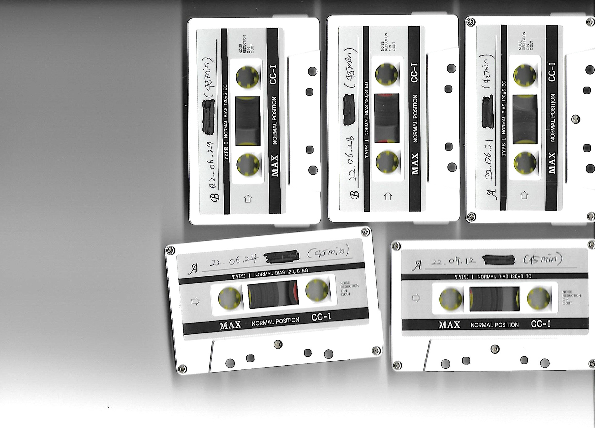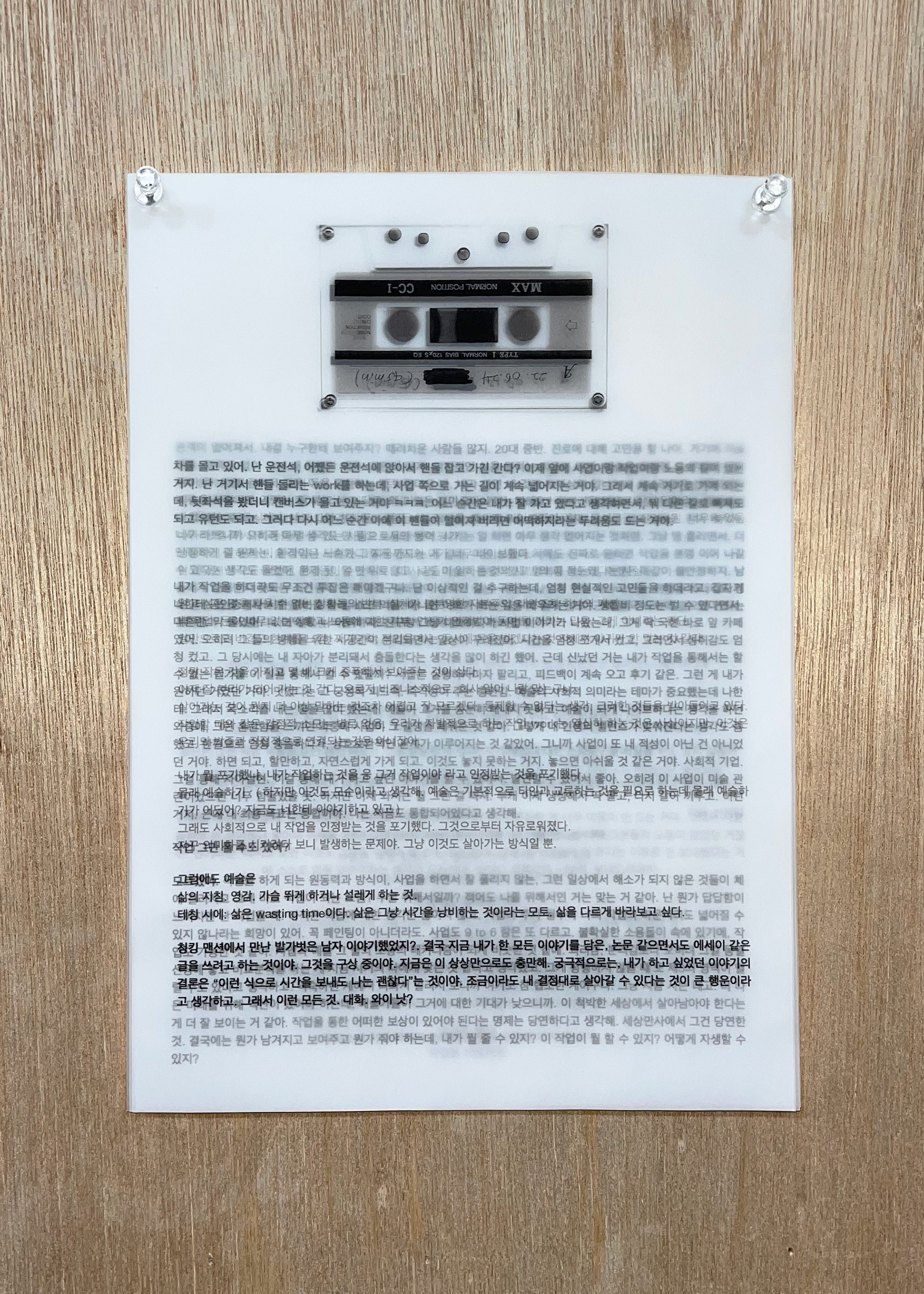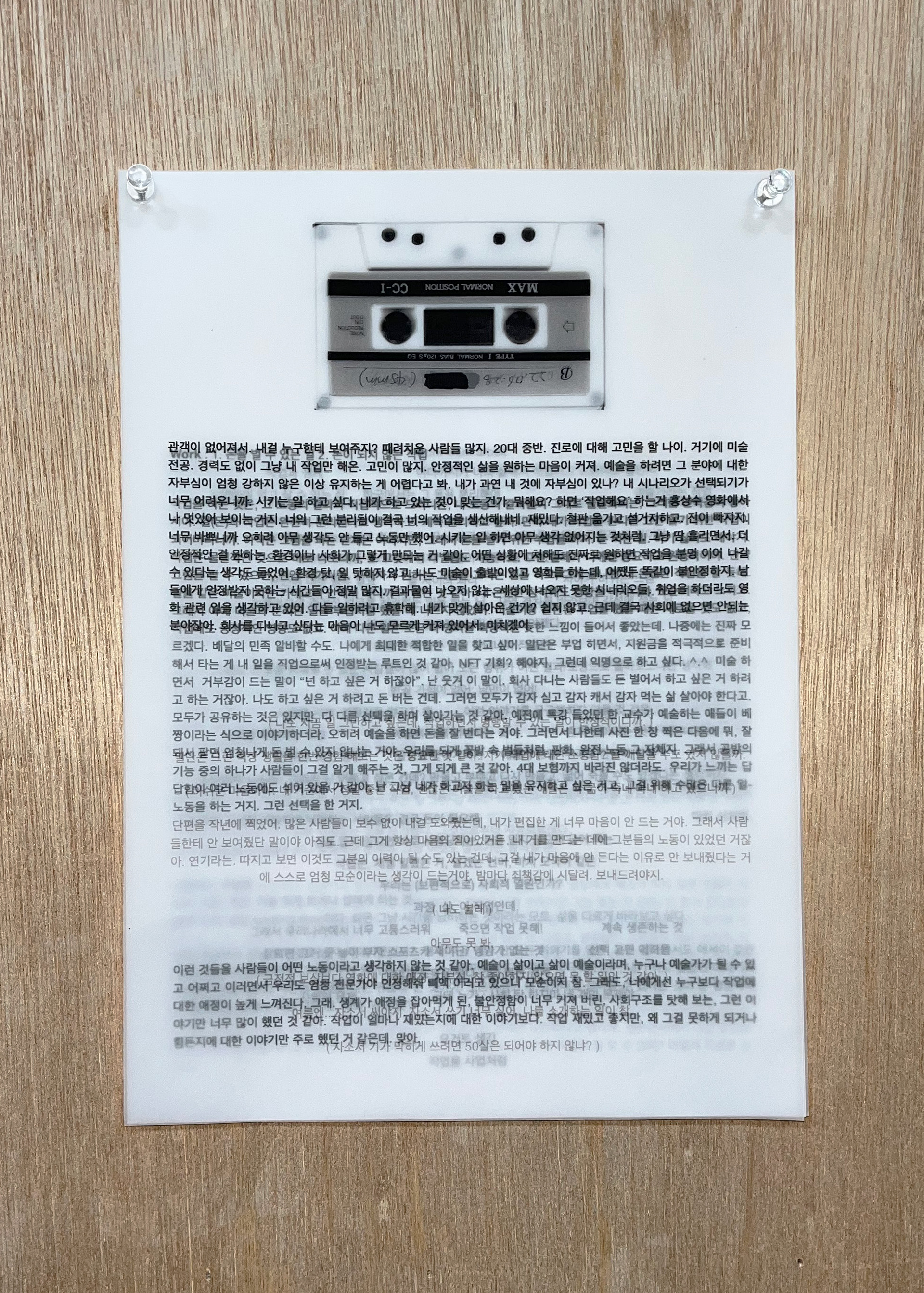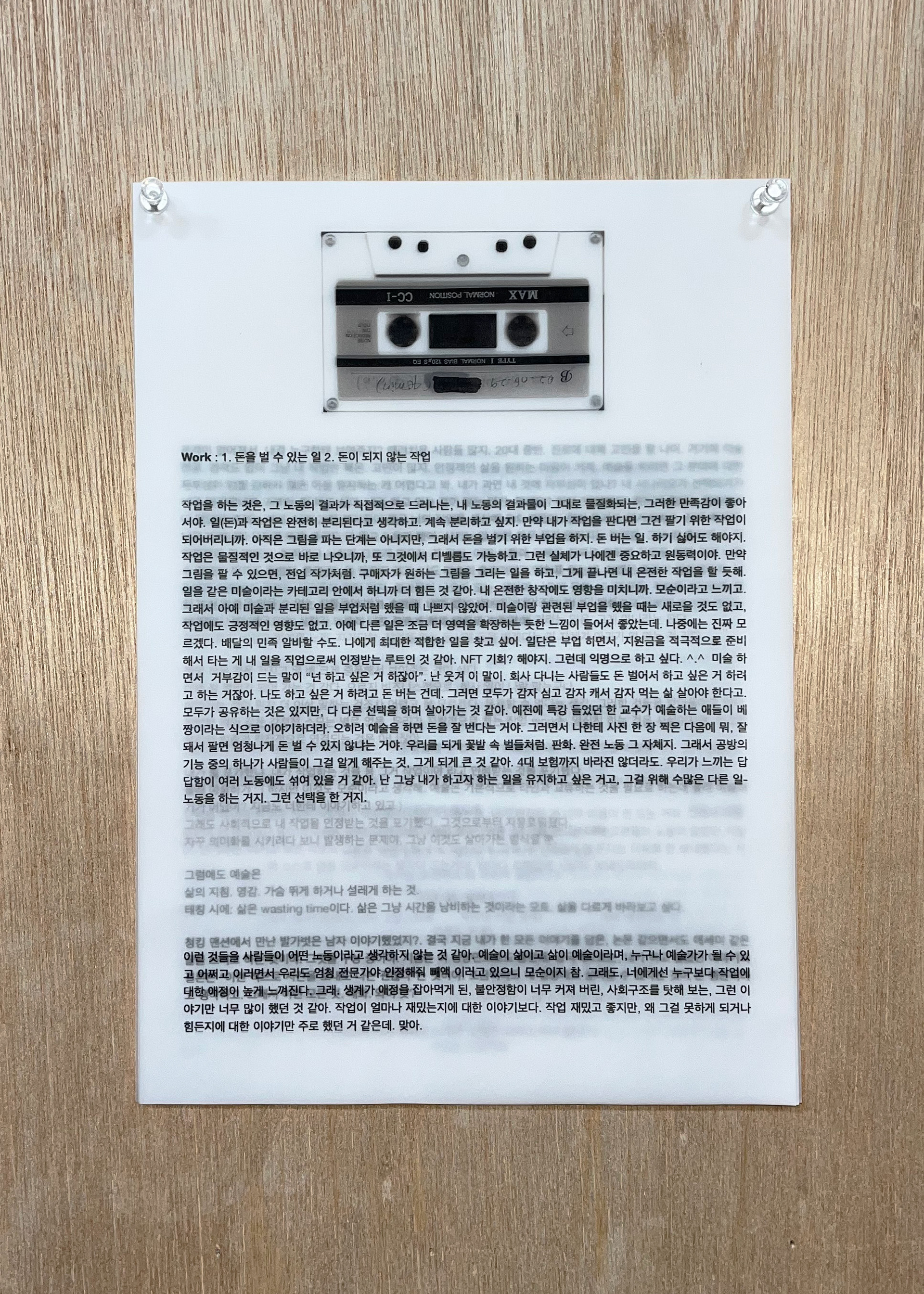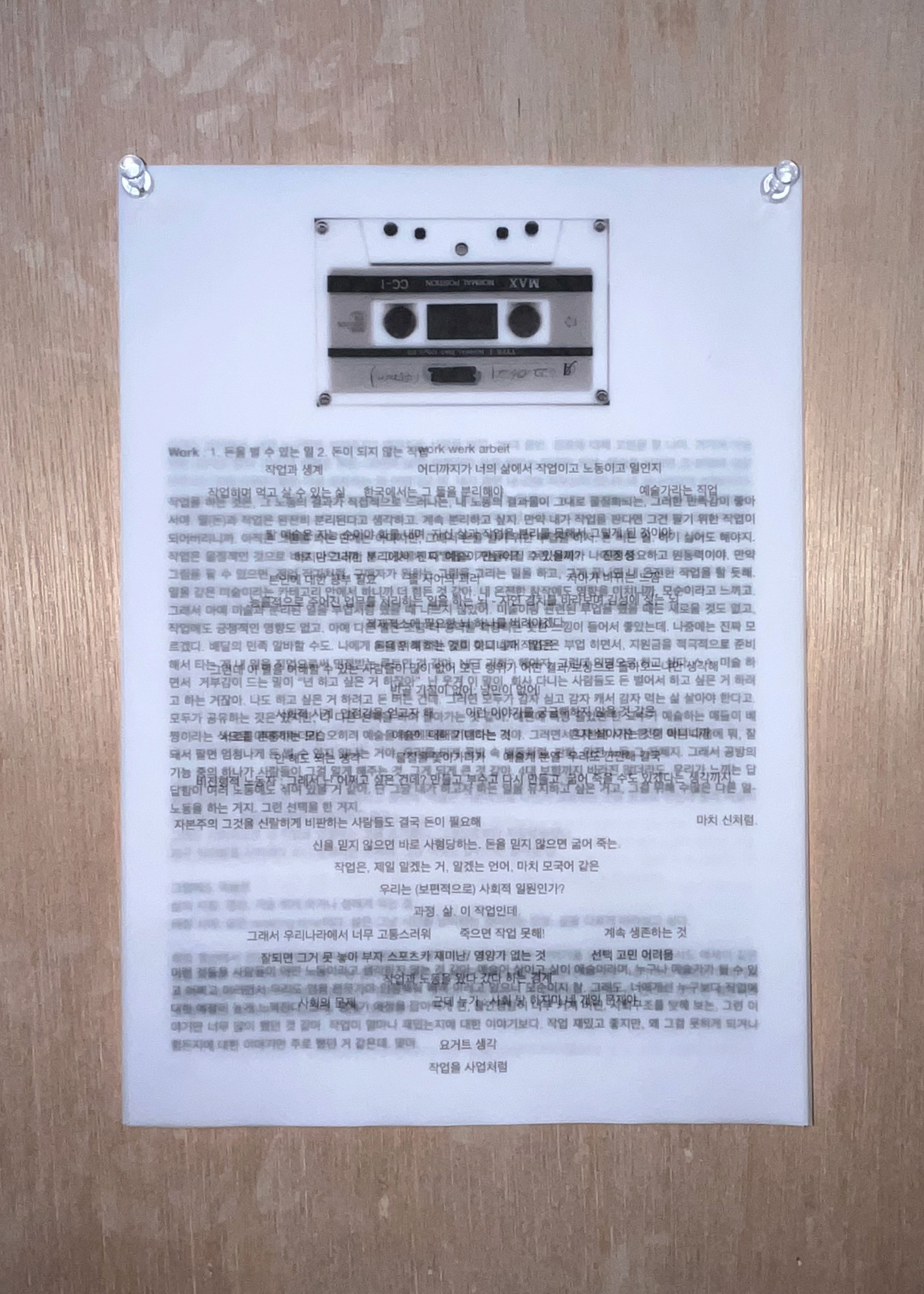 5개의 워크맨(walkman), 녹음 테이프, 디지털 프린트 이미지(59.4 x 84.1cm), 트레이싱지에 텍스트 프린트(29.7×21cm), 가변설치